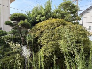 庭はもともと松の木などを中心にシンプルに作られていましたが、長年手入れをしていなかったため、雑草が増えて石の小道も隠れてしまっている状態とのこと…。