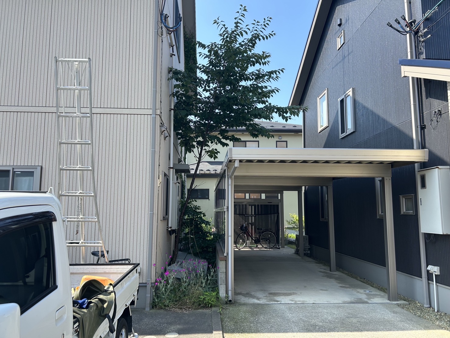 「隣の家との狭いスペースの間に、高さ約3メートルの細い木が生えていて、木の枝が隣のカーポートの上まで伸びてしまってる」